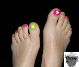 You’ve all seen her fancy colored fingernails in So Long Nigel, so you might as well see her “wa’urmelon toez,” as she called them, using her best English accent! An accent that is quite good, if I may say so. She’s pretty gifted in mimicking accents, like the time she came away from a perfume counter on a cruise telling me the prices of different sizes in her interpretation of a South African inflection, “It’s $19.95 for the smoll Papaw, or $29.95 for the larrz!”